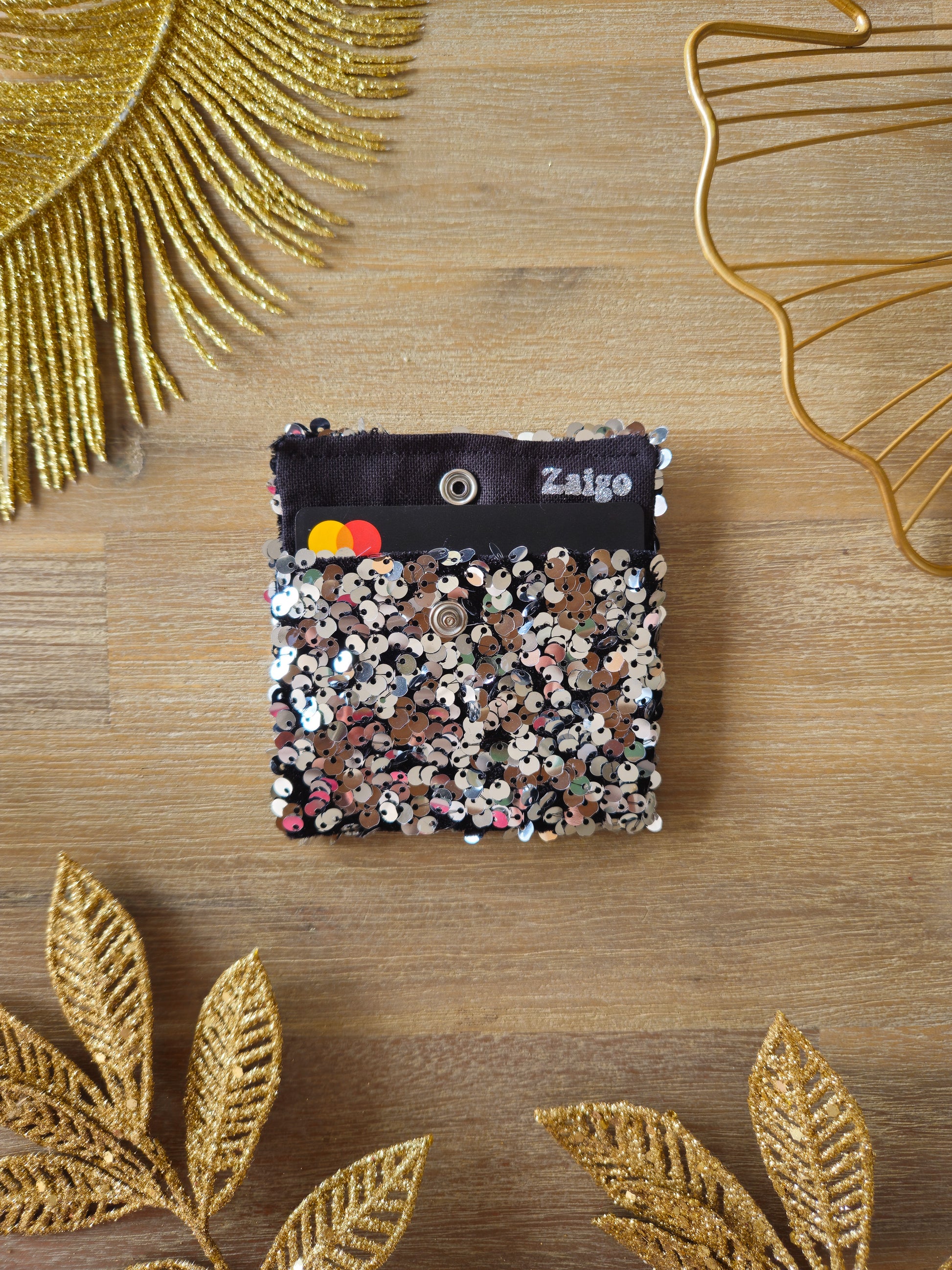 💳 Porte-cartes fabriqué à la main en tissu ✨ Silver Spark. Un sequin éclatant qui attire tous les regards.
